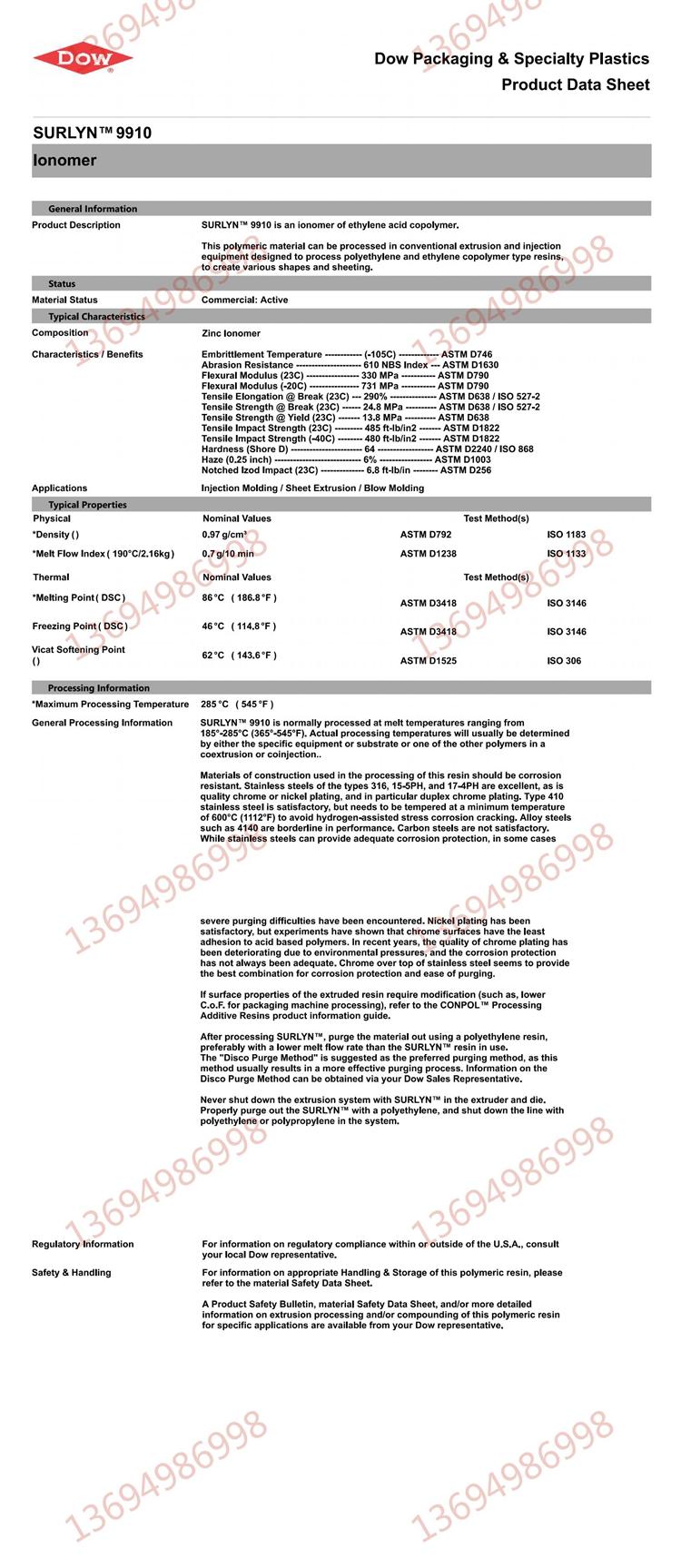 Dow 的 Surlyn? 9910 是一種輕質(zhì)、可靠、具有成本效益的鋅離聚物等級。具有良好的沖擊強度、出色的低溫韌性和良好的光學(xué)性能。提供低溫密封引發(fā)、出色的熱粘強度、良好的成型性、耐刮擦、耐溶劑和耐穿刺性。它密封污染物,有助于減少泄漏并提高生產(chǎn)線速度??赏ㄟ^吹塑、注塑和片材擠出加工。Surlyn? 9910 的可能應(yīng)用包括工業(yè)、食品包裝、化妝品、醫(yī)療器械、皮膚和拉伸、高爾夫球表面層、滑雪靴和包覆成型瓶。符合 21 CFR 177.1330(a)。