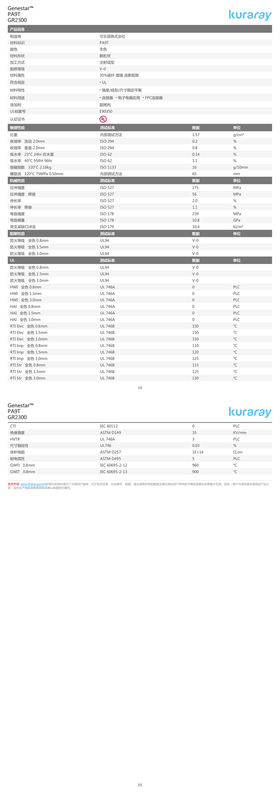 PA9T 可樂麗 Genestar GR2300 標準 鹵素阻燃V-0 玻璃含量30% 電子電器應用