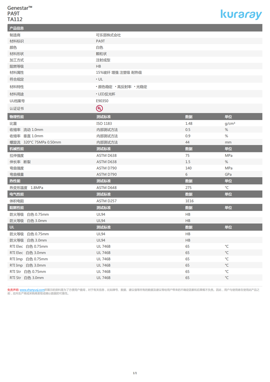 可樂麗 Genestar? PA9T TA112 >PA9T-GF15< 阻燃等級: HB 符合規(guī)定: UL