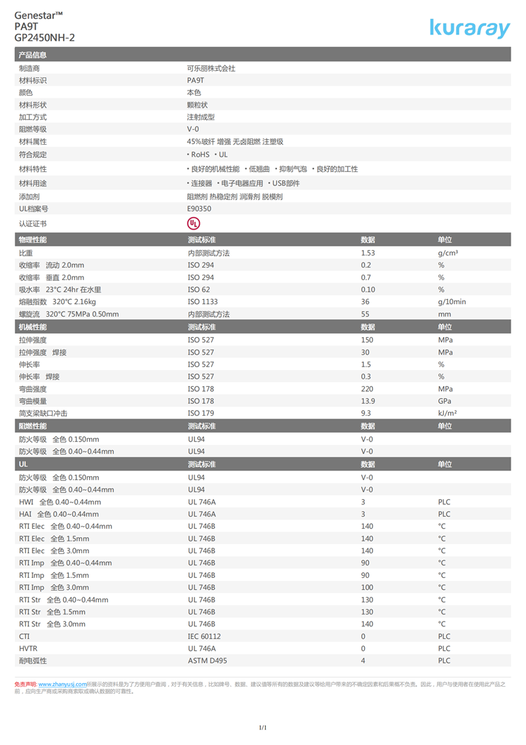 可樂麗 Genestar™ PA9T GP2450NH-2 >PA9T-GF45-FR< 阻燃等級(jí): V-0 缺口沖擊: 9.3 kJ/m2 符合規(guī)定: RoHS ? UL
