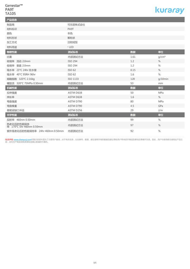 可樂麗 Genestar? PA9T TA105 >PA9T< 缺口沖擊: 2.95 kJ/m2 材料用途: LED
