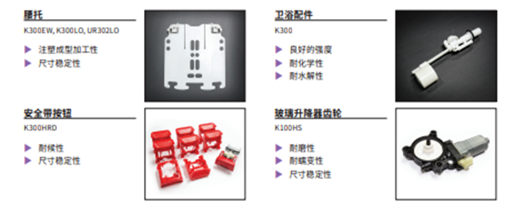 KOCETAL®是一種聚縮醛共聚物結(jié)晶度高的工程塑料。其代表性的特性是具有均衡的機械性能、低摩擦系數(shù)、優(yōu)秀的耐磨性、優(yōu)秀的耐燃料性的材料,吸濕率較低,具有穩(wěn)定的尺寸穩(wěn)定性。主要應(yīng)用范圍不僅有齒輪、燃油泵模塊、門鎖、車窗調(diào)節(jié)器部件、安全帶部件的車載部件,還可使用于冰箱、空調(diào)、打印機等家用電器驅(qū)動部件,以及扣環(huán)、拉鏈等日常生活用品等領(lǐng)域,可廣泛應(yīng)用。